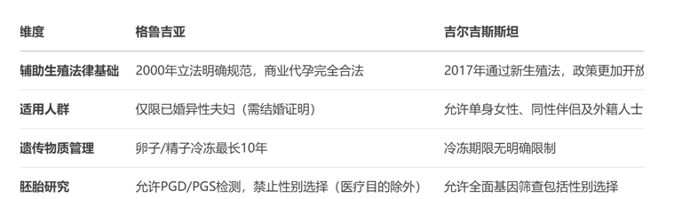 格鲁吉亚法律体系更成熟稳定,吉尔吉斯斯坦则在适用人群范围上更具突破性。值得注意的是,两国均要求代孕母亲必须为本国公民。